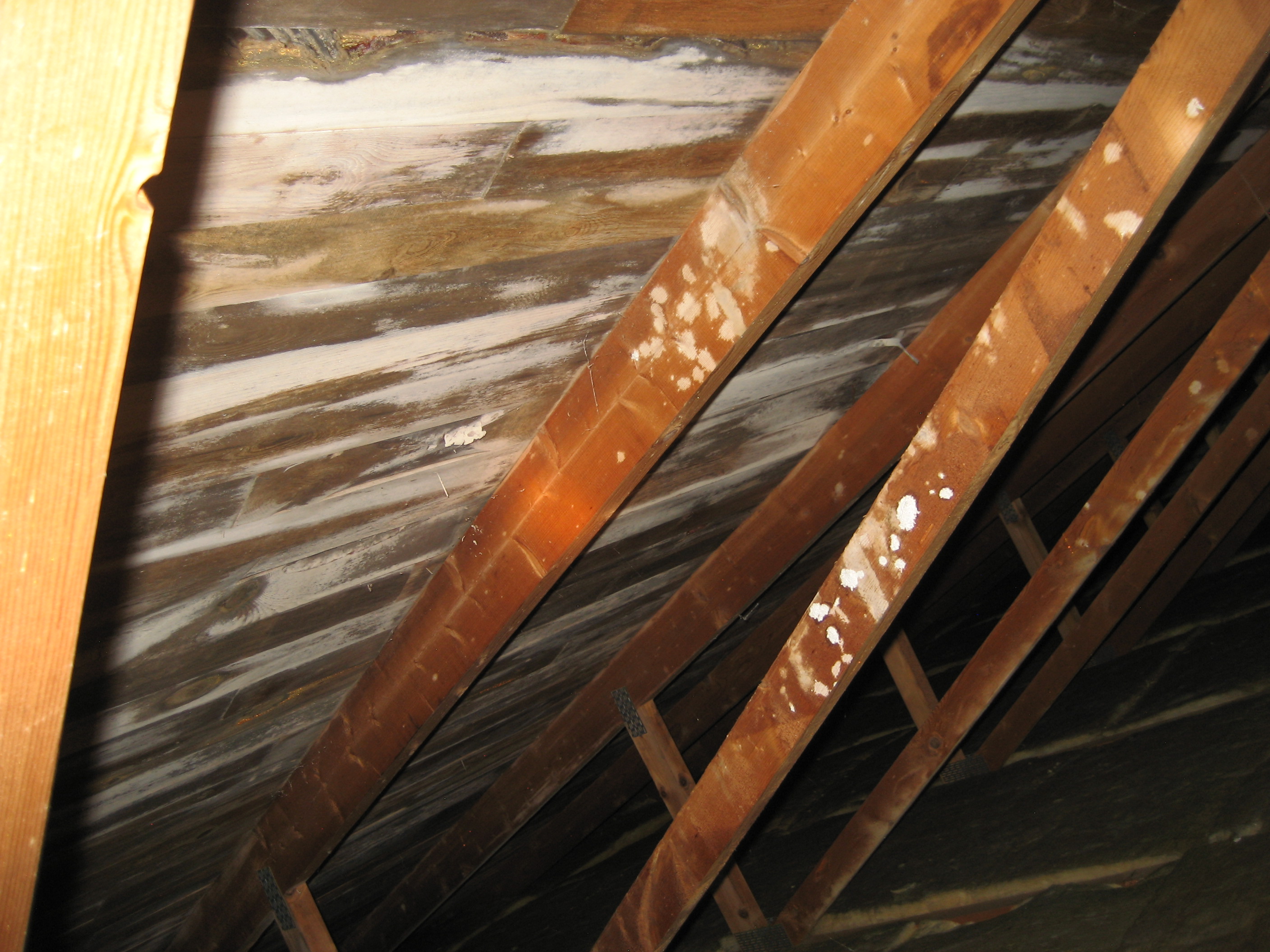 Til højre ses en tagkonstruktion, der er kraftigt angrebet af skimmelsvamp og trænedbrydende svamp. Dette skyldes for lidt/ manglende ventilering af tagrum.